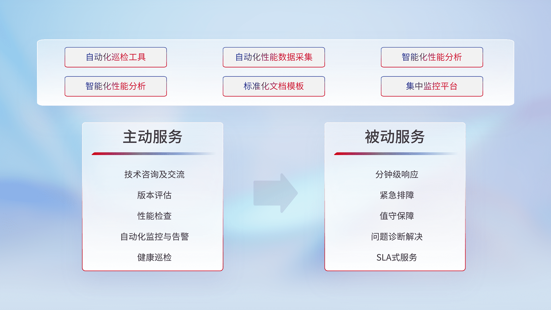 智能化工具和标准化文档,,保障服务质量,,提供主动服务(包含技术咨询、、、版本评估、、性能检查、、、、自动化监控与告警、、健康巡检)和被动服务包含(分钟级响应、、、、紧急排障、、、值守保障、、、、问题诊断解决、、、、SLA服务)。。。
