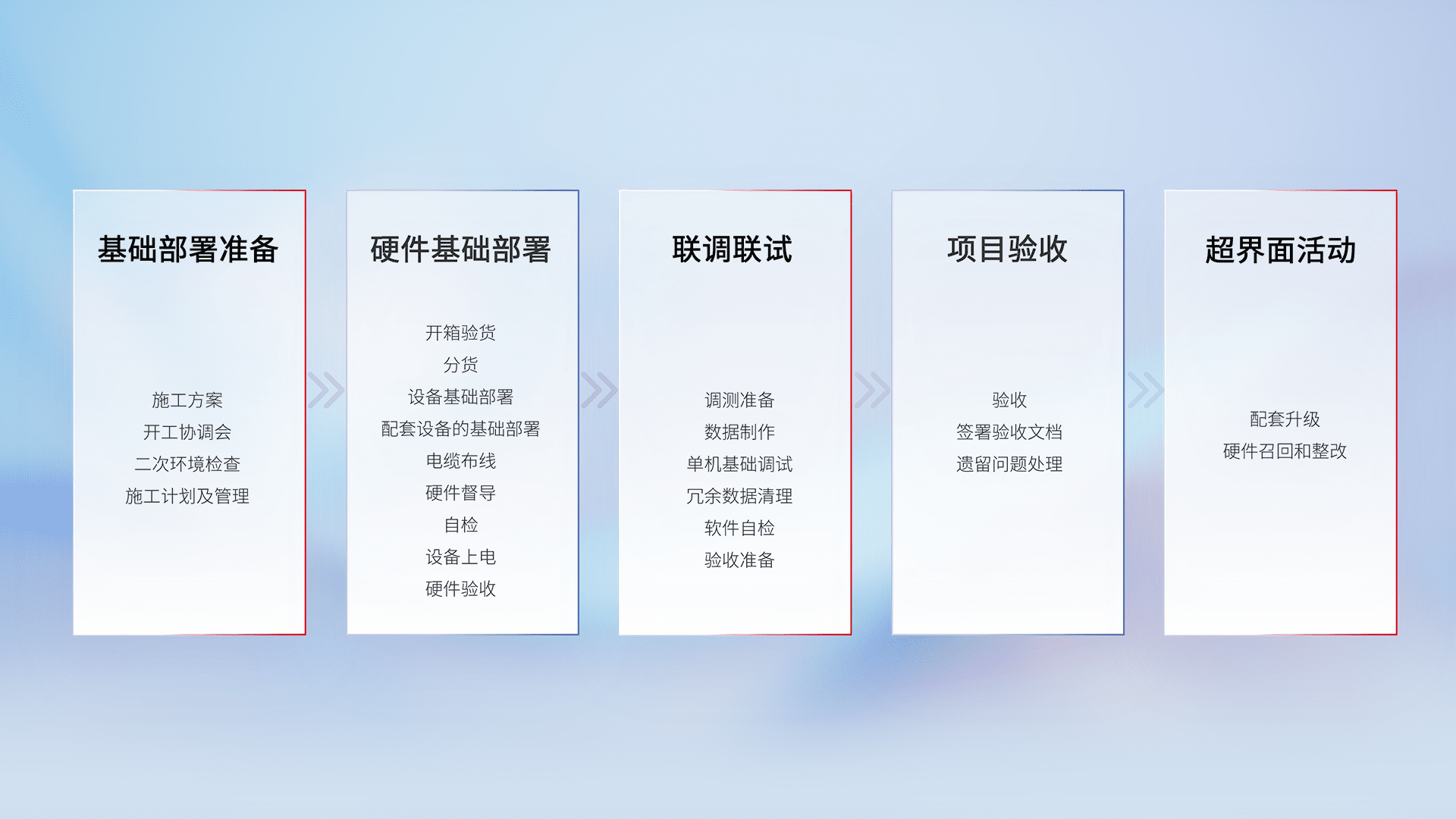 从基础部署准备、、、硬件基础部署、、、联调联试、、、项目验收、、越界面活动的全过程可追溯,,保证施工质量和进度。。。